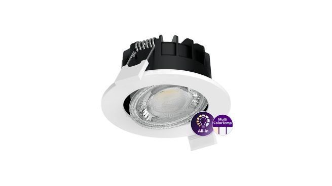 Adjustable, Metal–Plastic, White, Power supply unit (On/Off), All-in, Multi Color Temperature, 550 lm, 6 W, 91 lm/W, 2700 K, 3000 K, 4000 K, (IEC3000K, 0.44, 0.403) 5SDCM, Beam angle 40°, Clear, Polycarbonate, IP20/65 | Finger-protected; Dust penetration-protected, jet-proof, IK03 | 0.35 J reinforced, Safety class II, Push-in connector 3-pole