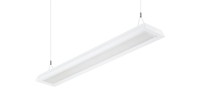 1470x200 mm; H73 mm, Steel, White, Signal white (RAL9003), Suspension set twin, triangle, Power supply unit with DALI interface, 6000 lm, 49.5 W, 140 lm/W, 3000 K, (0.43, 0.40) SDCM <3, CRI>90, UGR19, Wide beam, Textured, Polycarbonate, IP20 | Finger-protected, IK02 | 0.2 J standard, Safety class I, Push-in connector 5-pole